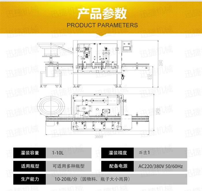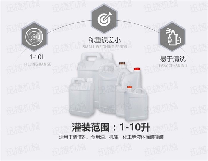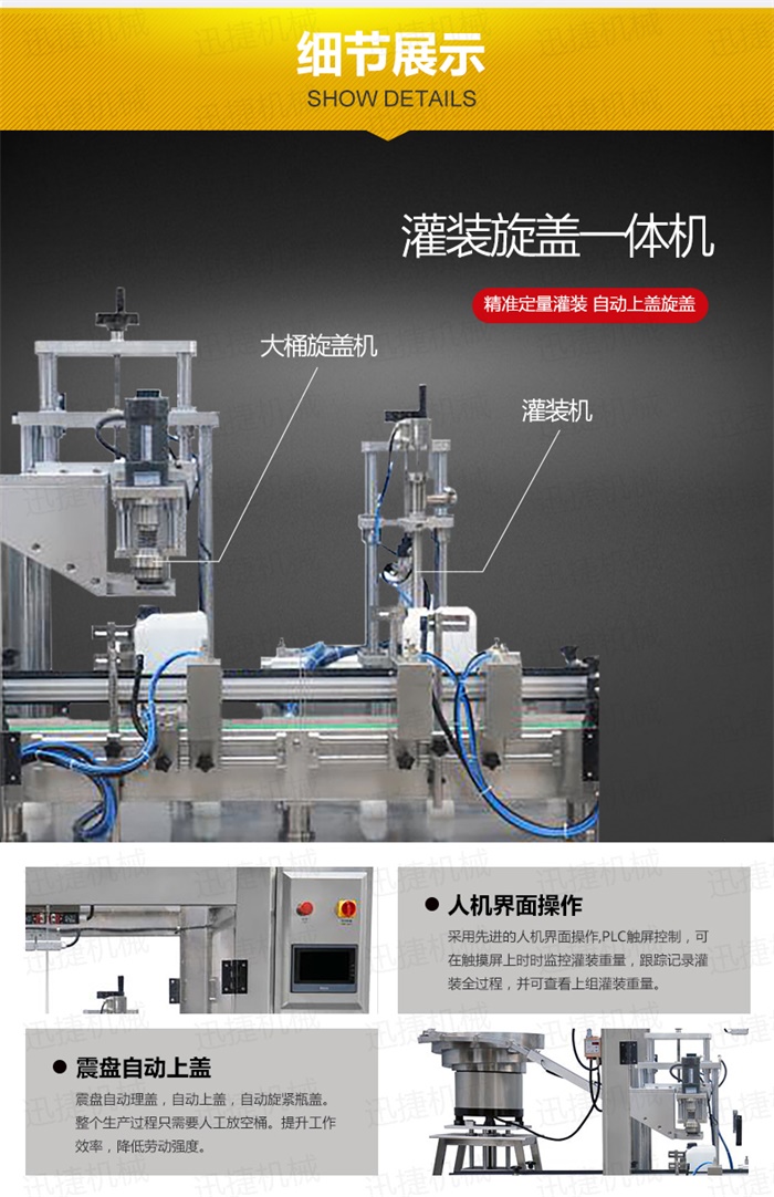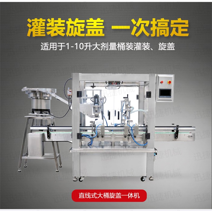 特點:定量灌裝,和瓶蓋旋蓋,在一臺機器上完成。具有占地空間小,自動化程度高特點工作流程:液體灌裝頭自動定位定量灌裝,機器灌裝完成1-10升的灌裝,隨即進入下一個工位,震盤自動理蓋,自動上蓋,自動旋緊瓶蓋。整個生產(chǎn)過程只需要人工放空桶。提升工作效率,降低勞動強度。