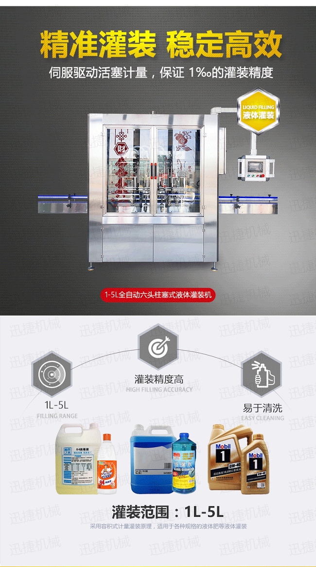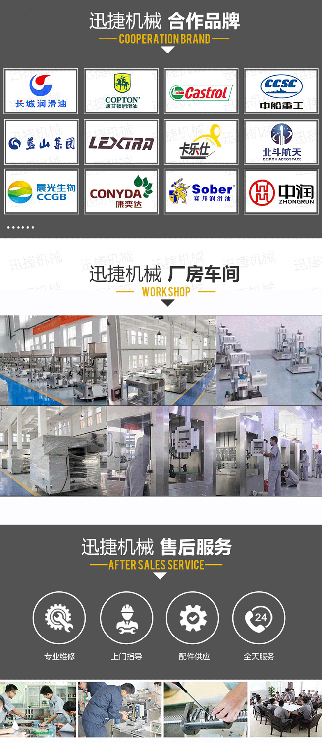該機(jī)是我司很新研制的潤(rùn)滑油定量灌裝機(jī),設(shè)備集光、電、氣于一體,由PLC配合人機(jī)界面(觸摸屏)控制,從進(jìn)瓶、定位、灌裝、出瓶等動(dòng)作均全自動(dòng)完成。采用直流式灌裝,與物料接觸部分均采用出色不銹鋼和食品級(jí)材料制成,符合食品衛(wèi)生要求;自動(dòng)化程度高,性能穩(wěn)定,生產(chǎn)速度快,灌裝準(zhǔn)確,操作簡(jiǎn)單、調(diào)整方便,適應(yīng)性強(qiáng)等特點(diǎn)。