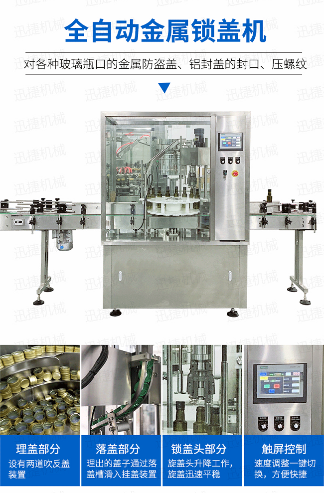 本設(shè)備適用于食品、化妝品、化工等行業(yè),主要針對各種玻璃瓶口的金屬防盜蓋鋁封蓋的封口、壓螺紋等。該設(shè)備可單機使用,也可以與灌裝機等設(shè)備組成生產(chǎn)流水線自動作業(yè);