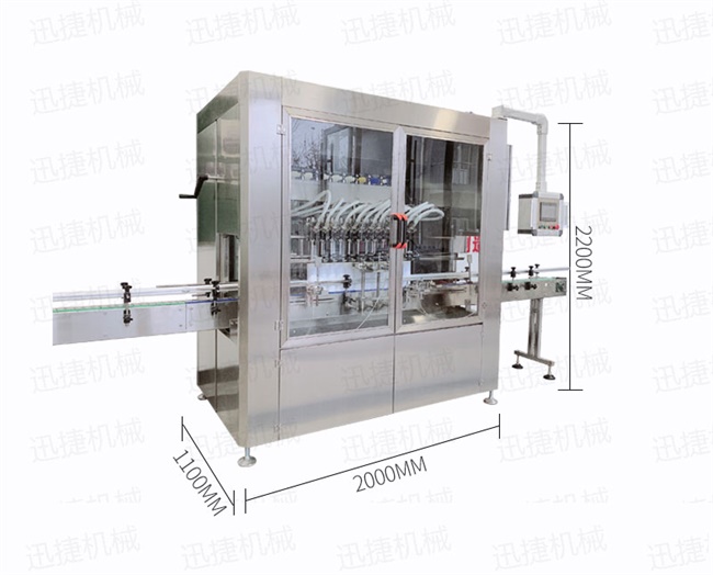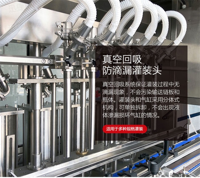 1.真空回吸系統(tǒng)保證灌裝過程中無滴漏現(xiàn)象,不會(huì)污染輸送鏈板和瓶體。灌裝頭和氣缸采用分體式機(jī)構(gòu),可單獨(dú)拆卸,不會(huì)出現(xiàn)液體滲漏損壞氣缸的情況。進(jìn)口亞德客氣缸經(jīng)久耐用,其他密封等配件使用標(biāo)準(zhǔn)件,更換維護(hù)簡(jiǎn)單方便。