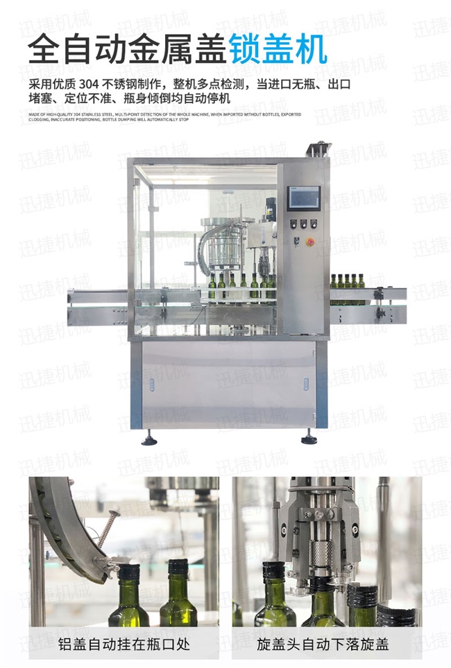 5、整機(jī)多點(diǎn)檢測(cè),當(dāng)進(jìn)口無瓶、出口堵塞、定位不準(zhǔn)、瓶身傾倒均自動(dòng)停機(jī)。