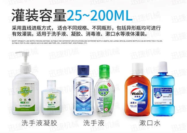 全自動凝膠生產(chǎn)線適用于消毒凝膠、免洗手洗手液、免洗手消毒凝膠、消毒液、84消毒液、醫(yī)用酒精、75%酒精消毒液、75度酒精、消毒水、殺菌消毒劑、醫(yī)用酒精、碘酒、次氯酸鈉、劑、醫(yī)用乙醇消毒液、瓶裝消毒劑等產(chǎn)品,有多頭全自動消毒液灌裝機(jī)和封箱機(jī)、貼標(biāo)機(jī)、打包機(jī)、噴碼機(jī)等配套設(shè)備組成,實(shí)現(xiàn)消毒液自動灌裝,自動旋蓋,自動貼標(biāo),從灌裝、到成品的全部過程