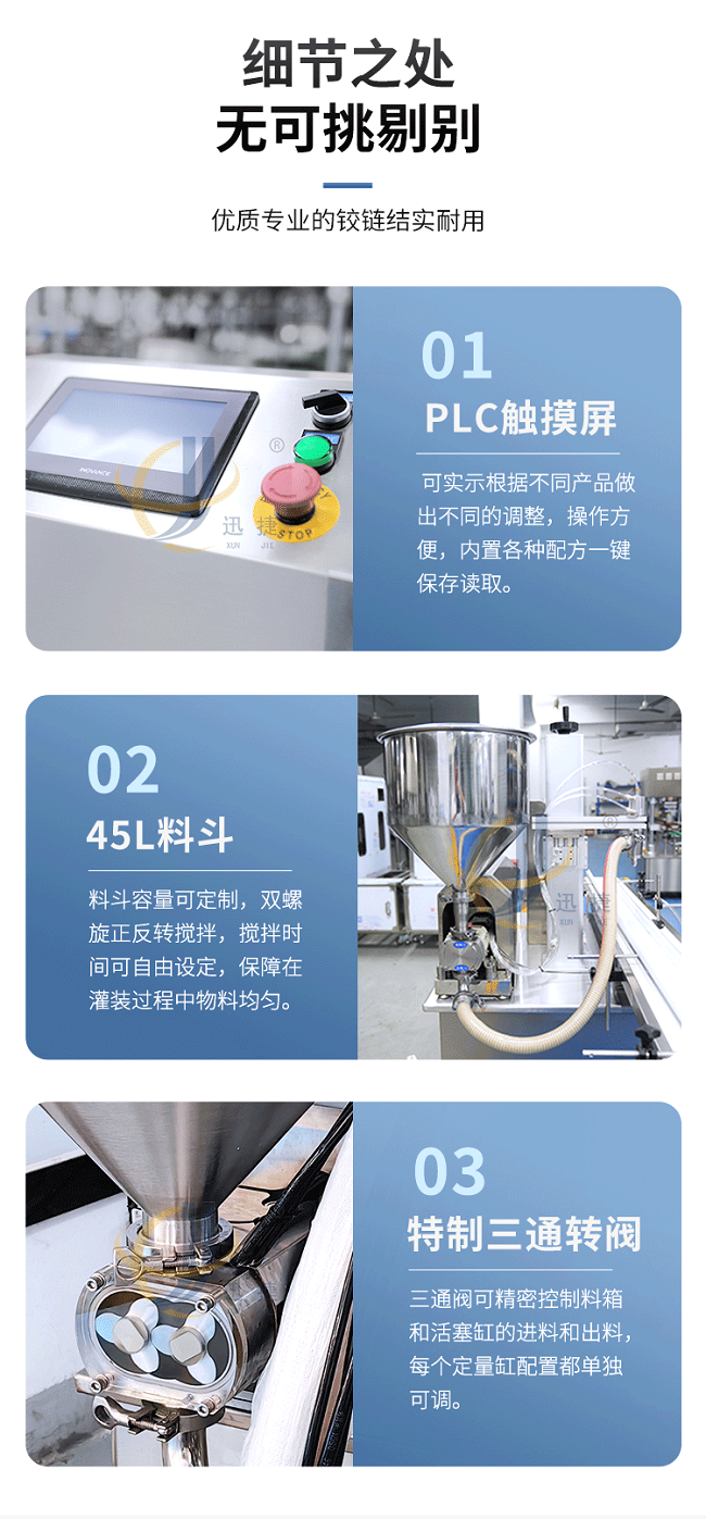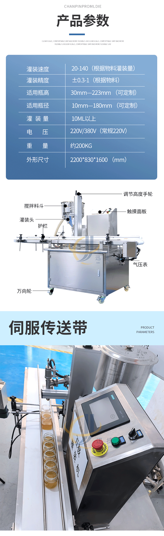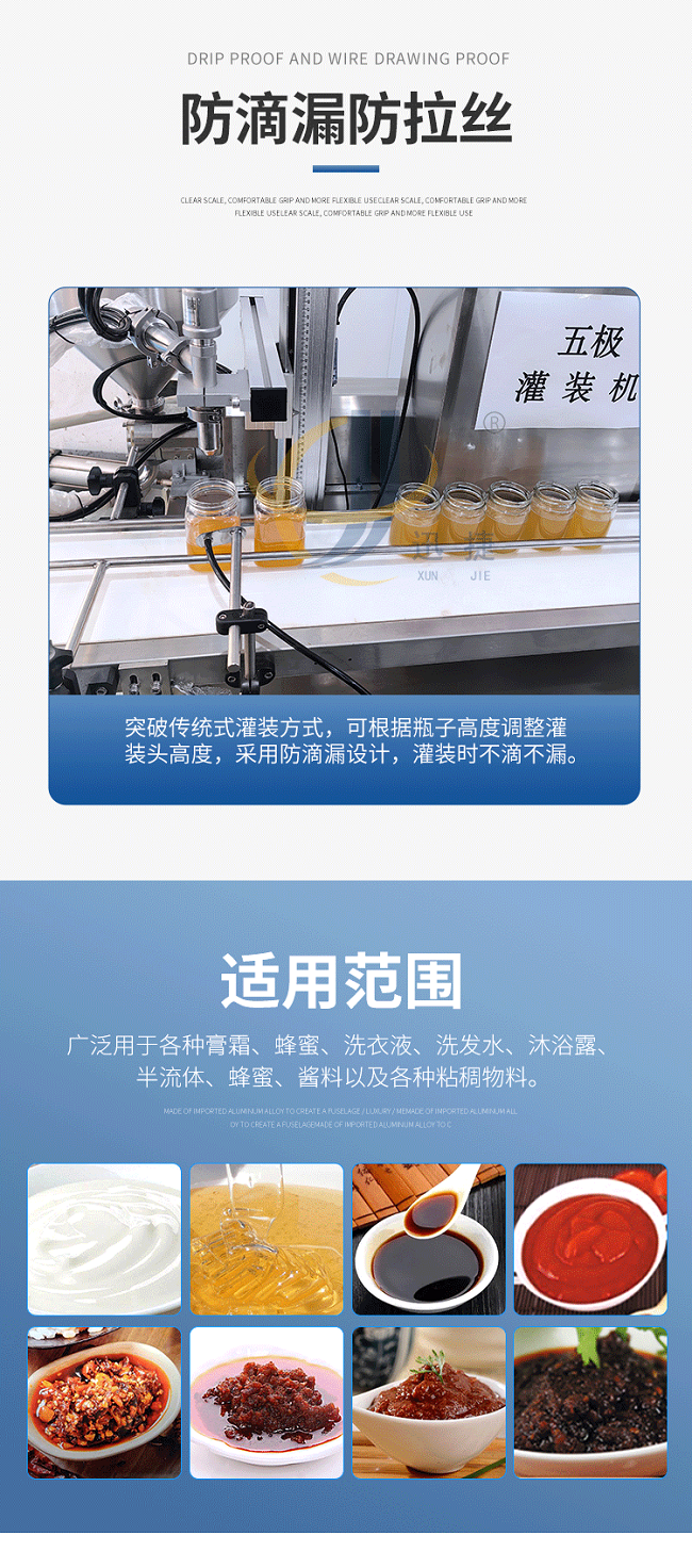 我公司新研發(fā)五極醬料灌裝機,五極分為極快,極簡,極穩(wěn),極廣,極準(zhǔn),廣泛適用于各種膏霜、蜂蜜、洗衣液、洗發(fā)水、半流體、蜂蜜、醬料以及各種粘稠物料,該產(chǎn)品支持定制,選用306不銹鋼材質(zhì),灌裝精度高,防止滴漏,選用plc觸屏智能控制,防滴漏防拉絲,突破傳統(tǒng)的灌裝方式,可根據(jù)瓶子高度調(diào)整灌裝頭高度,采用防滴漏設(shè)計,灌裝時不滴不漏。