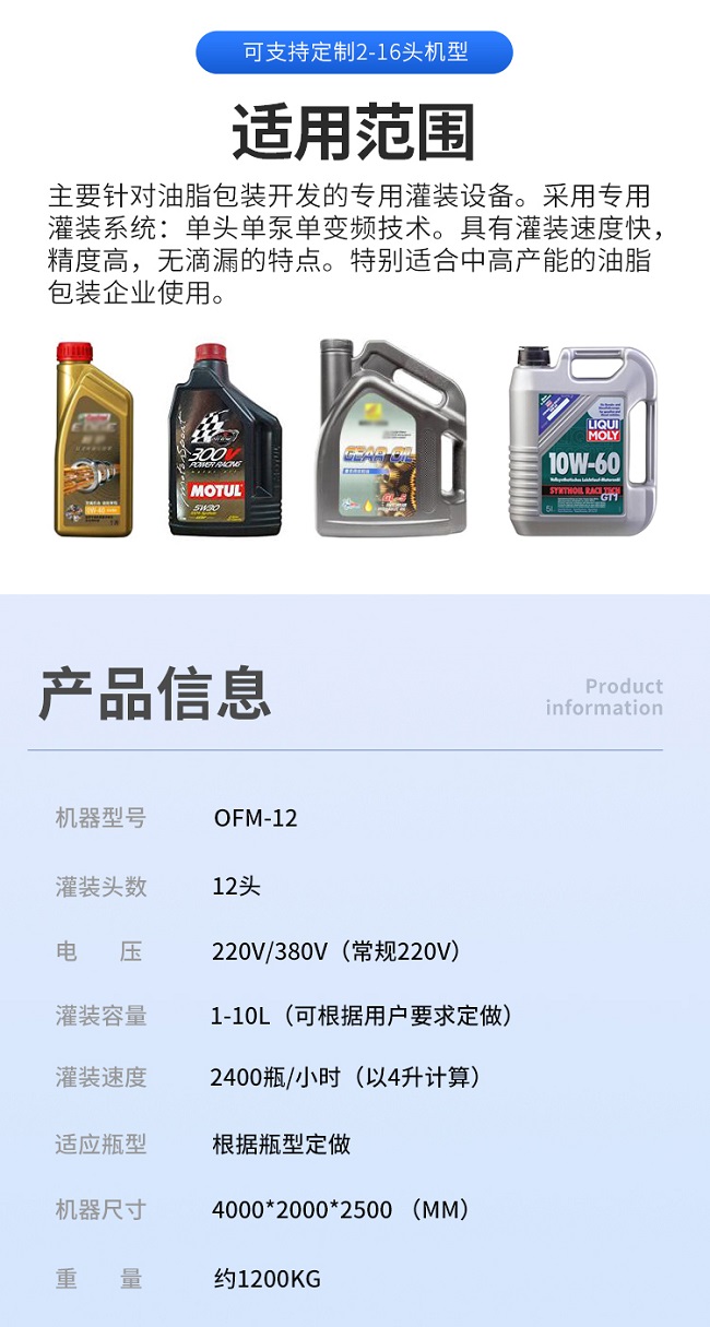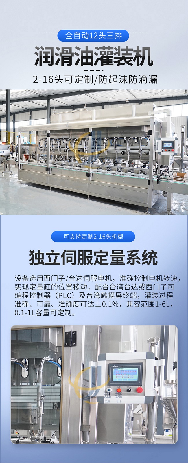 這款全自動十二頭三排潤滑油灌裝機是本公司專為潤滑油廠家研發(fā)的自動化設備,這款潤滑油灌裝機2-16頭可定制,防起沫防滴漏。主要針對油脂包裝開發(fā)的專用灌裝設備。采用專用灌裝系統(tǒng):單頭單泵單變頻技術。具有灌裝速度快,精度高,無滴漏的特點。特別適合中高產(chǎn)能的油脂包裝企業(yè)使用。