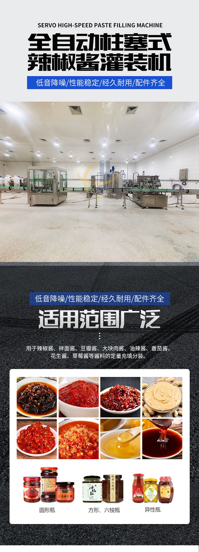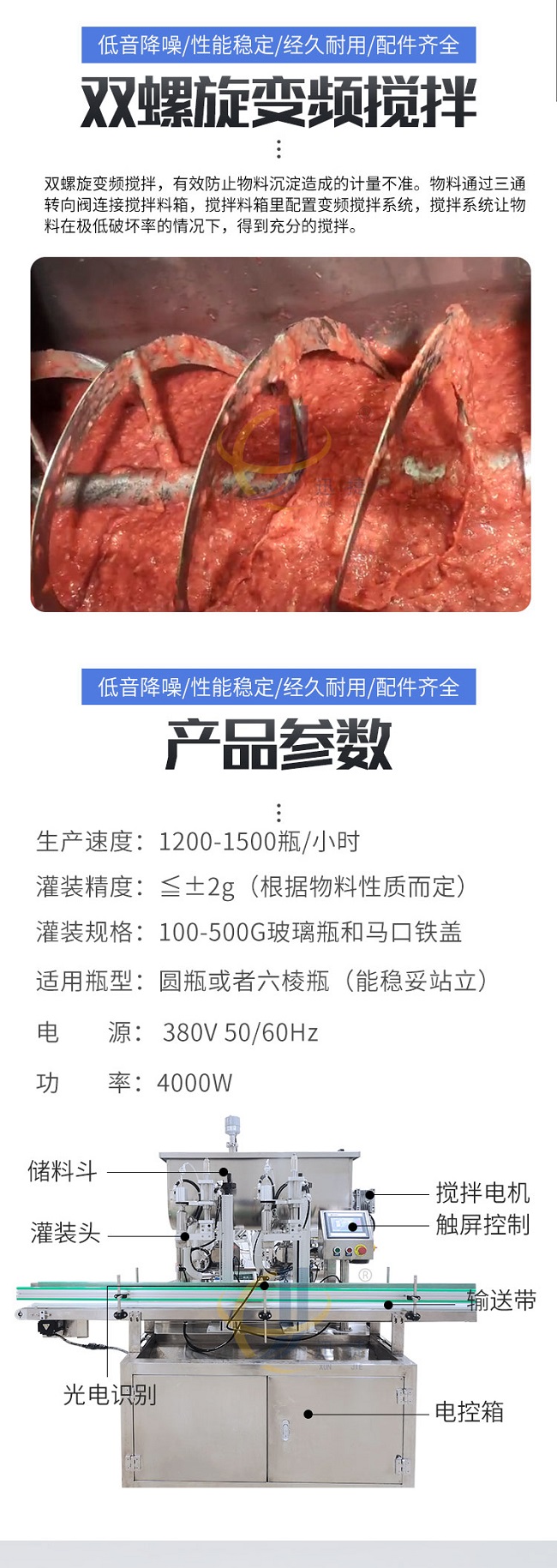 這款柱塞式辣椒醬灌裝機(jī)低音降噪、性能穩(wěn)定、經(jīng)久耐用、配件齊全,適用范圍廣泛用于辣椒醬、拌面醬、豆瓣醬、大塊肉醬、油辣醬、番茄醬花生醬、草莓醬等醬料的定量充填分裝。雙螺旋變頻攪拌,有效防止物料沉淀造成的計(jì)量不準(zhǔn)。物料通過(guò)三通轉(zhuǎn)向閥連接攪拌料箱,攪拌料箱里配置變頻攪拌系統(tǒng),攪拌系統(tǒng)讓物料在極低破壞率的情況下,得到充分的攪拌。