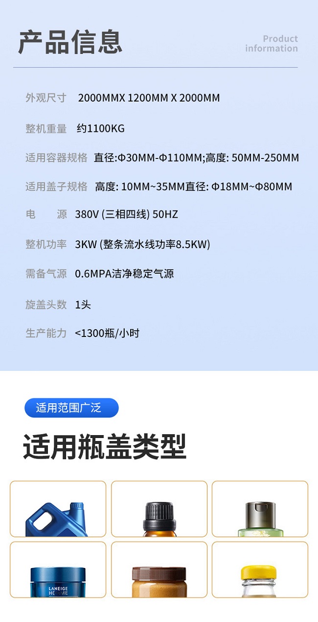 跟蹤式旋蓋機(jī)是在聯(lián)機(jī)取放旋蓋機(jī)的基礎(chǔ)上設(shè)計(jì)的,它解決了聯(lián)機(jī)拾放旋蓋機(jī)容量低的問題,其運(yùn)動(dòng)由運(yùn)動(dòng)控制器控制,比PLC更、更準(zhǔn)確,封蓋時(shí),封蓋頭隨著瓶子的移動(dòng)而移動(dòng)。它可以配備一個(gè)或兩個(gè)封蓋頭,容量從 40B/M 到70B/M 無需考慮瓶子和蓋子的大小(基于 100ML到5000ML瓶子)。