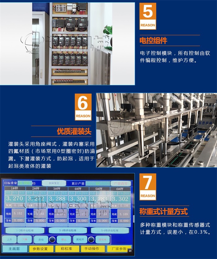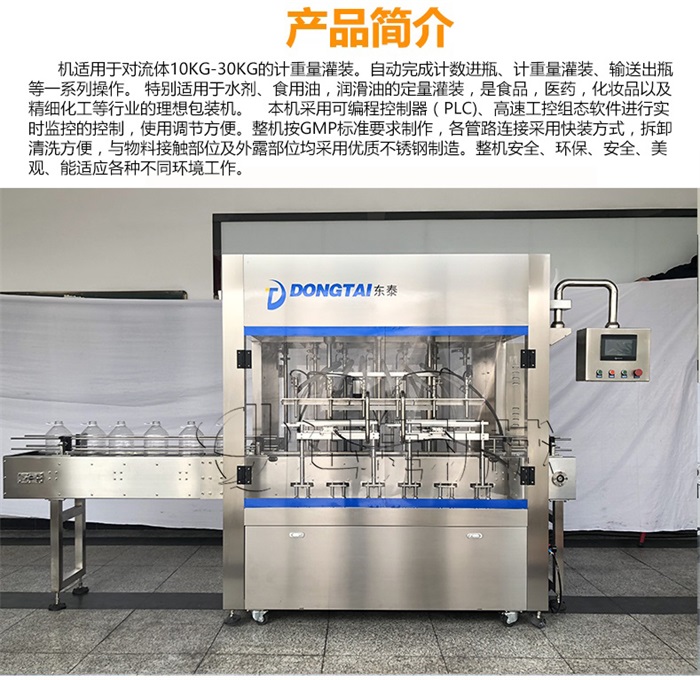 機適用于對流體5kg-30kg的計重量灌裝。自動完成計數(shù)進瓶、計重量灌裝、輸送出瓶等一系列操作。 特別適用于水劑、食用油,潤滑油的定量灌裝,是食品,醫(yī)藥,化妝品以及精細化工等行業(yè)的包裝機。本機采用可編程控制器(PLC)、高速工控組態(tài)軟件進行實時監(jiān)控的控制,使用調節(jié)方便。整機按GMP標準要求制作,各管路連接采用快裝方式,拆卸清洗方便,與物料接觸部位及外露部位均采用優(yōu)質不銹鋼制造。整機安全、環(huán)保、安全、美觀、能適應各種不同環(huán)境工作。