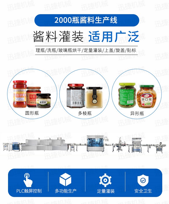 牛肉顆粒醬各種各樣的包裝方式在我們的生活中并不少見,隨著牛肉顆粒醬灌裝豐富化時(shí)代的到來,那么針對這么多包裝需求只要選擇這款全自動(dòng)牛肉顆粒醬灌裝機(jī)設(shè)備就可以輕松的去實(shí)現(xiàn)多樣化的包裝方法,具備無滴漏灌裝;管道采用快裝式鏈接,完全符合衛(wèi)生要求,拆洗維護(hù)方便;全自動(dòng)牛肉顆粒醬灌裝機(jī)設(shè)備還保障了瓶口干凈衛(wèi)生,輸送帶干凈衛(wèi)生,符合GMP標(biāo)準(zhǔn)有著操作調(diào)節(jié)便利,無瓶不灌裝,自動(dòng)檢測,計(jì)數(shù)等一些類比較出色的優(yōu)勢特點(diǎn),迅捷機(jī)械可根據(jù)客戶需求配理瓶機(jī)、旋蓋機(jī),貼標(biāo)機(jī),打碼機(jī)等設(shè)備來實(shí)現(xiàn)自身企業(yè)的實(shí)際生產(chǎn)需求。